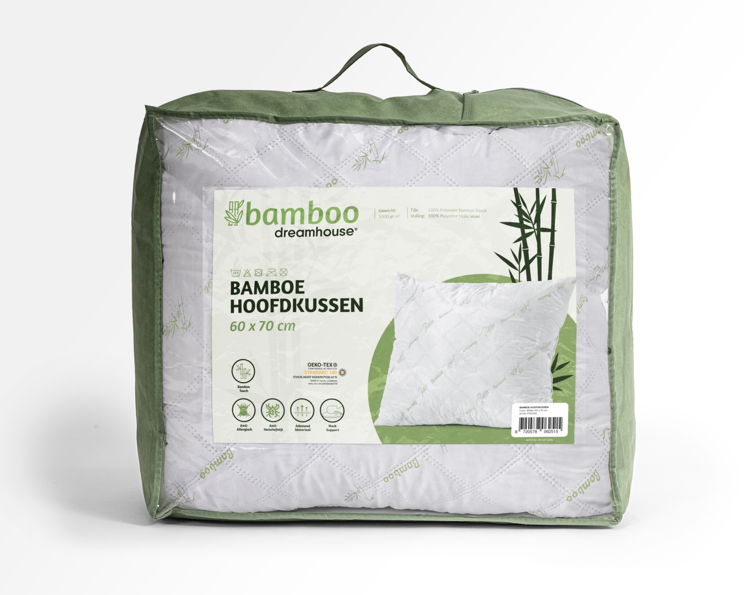 Het Bamboo Hoofdkussen heeft een witte kleur en is voorzien van een tijk gemaakt van 100% polyester met een bamboo touch. Dit zorgt niet alleen voor een zacht en luxueus gevoel, maar ook voor duurzaamheid en een goede ventilatie.