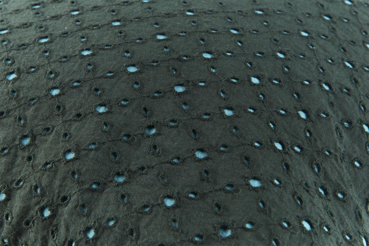 Sierkussen Chelsy speelt in op de trend embroidery anglaise. De voorkant van het sierkussen bestaat uit blauwe geborduurde gaatjes op een donkergroene achtergrond. De achterzijde van het kussen heeft een effen donkergroene kleur. Dit sierkussen is verkrijgbaar in meerdere kleurstellingen. Sierkussen Chelsy is gemaakt van 100% katoen. Het formaat is 40 x 40 cm. Het kussen heeft aan de onderkant een ritssluiting en wordt geleverd inclusief een veerkrachtig polyester binnenkussen. Leuk detail: het sierkussen heeft een gouden puller aan de ritssluiting in de vorm van een Amsterdams grachtenpandje. Het kussen is niet geschikt voor de wasmachine en droger.