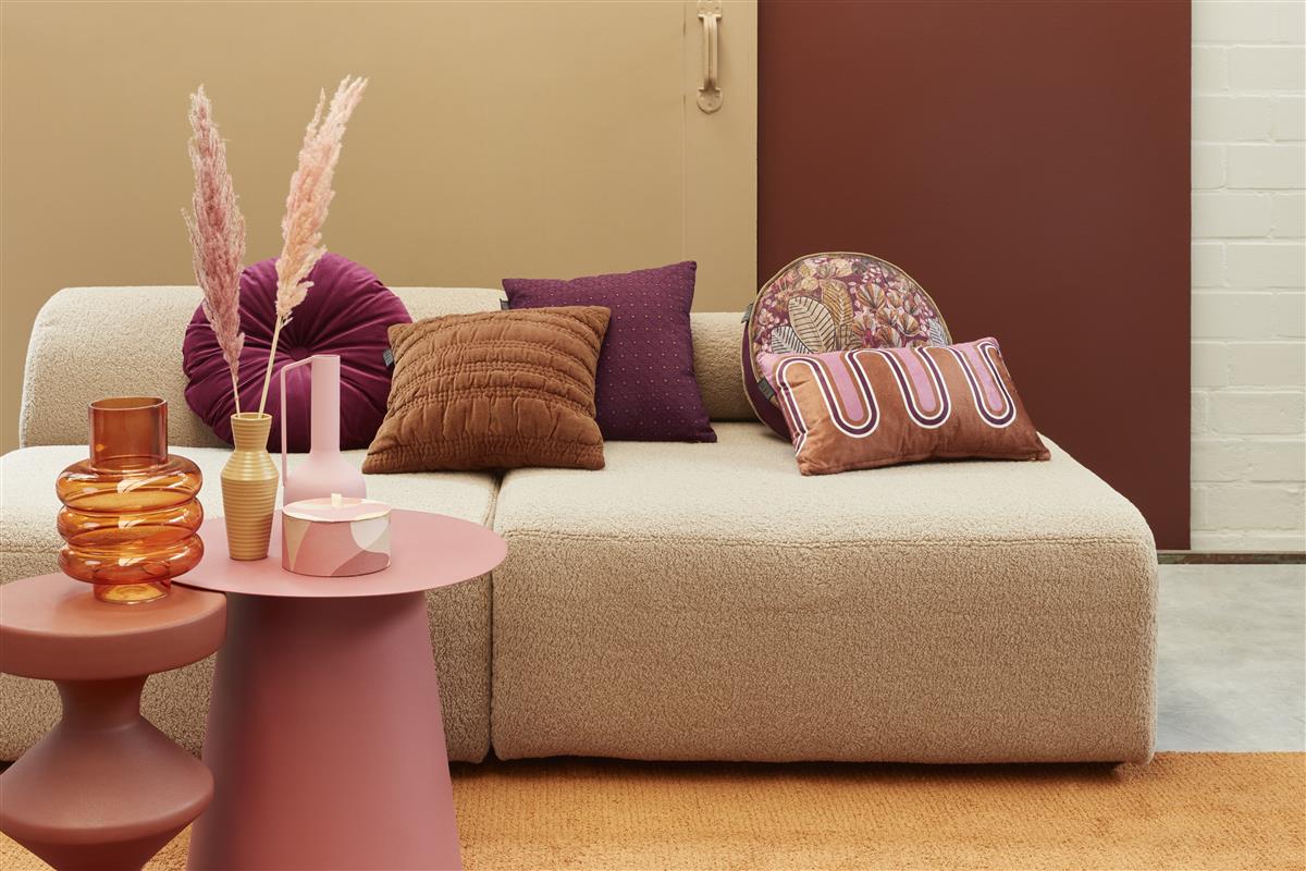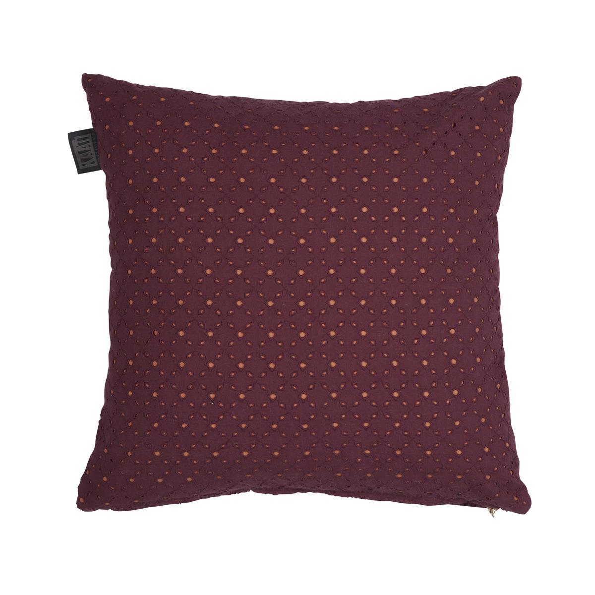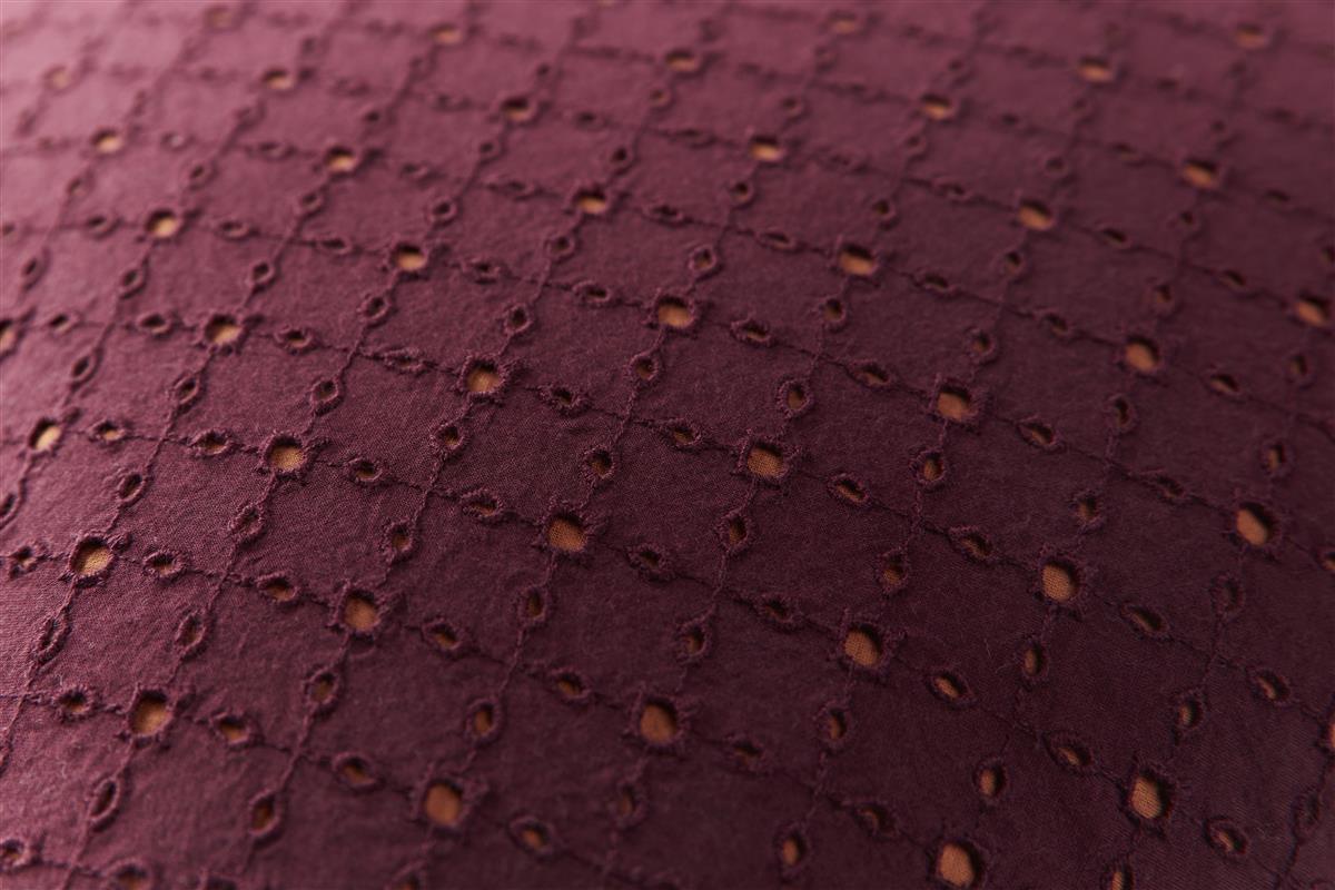 Sierkussen Chelsy speelt in op de trend embroidery anglaise. De voorkant van het sierkussen bestaat uit terra geborduurde gaatjes op een paarse achtergrond. De achterzijde van het kussen heeft een effen paarse kleur. Dit sierkussen is verkrijgbaar in meerdere kleurstellingen. Sierkussen Chelsy is gemaakt van 100% katoen. Het formaat is 40 x 40 cm. Het kussen heeft aan de onderkant een ritssluiting en wordt geleverd inclusief een veerkrachtig polyester binnenkussen. Leuk detail: het sierkussen heeft een gouden puller aan de ritssluiting in de vorm van een Amsterdams grachtenpandje. Het kussen is niet geschikt voor de wasmachine en droger.