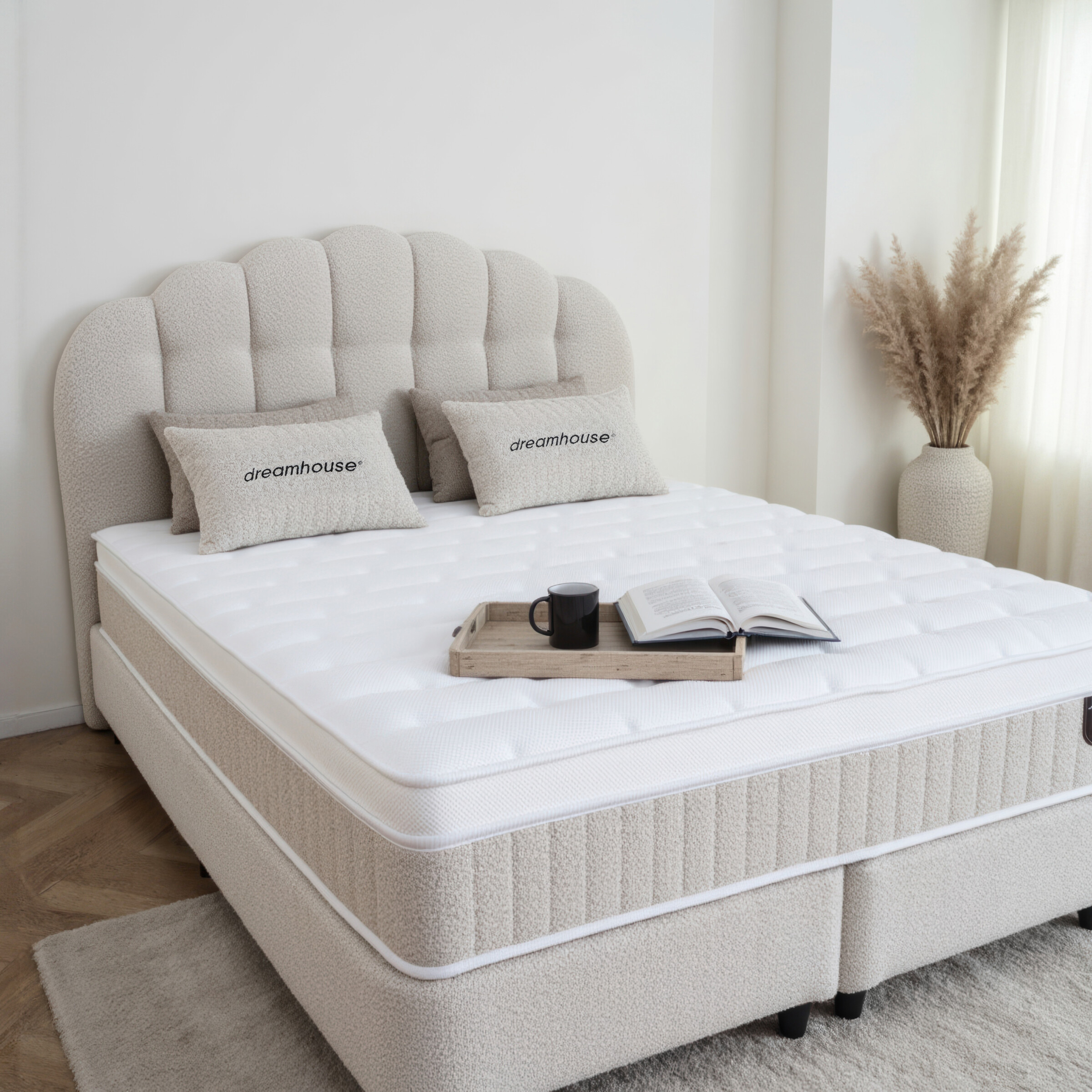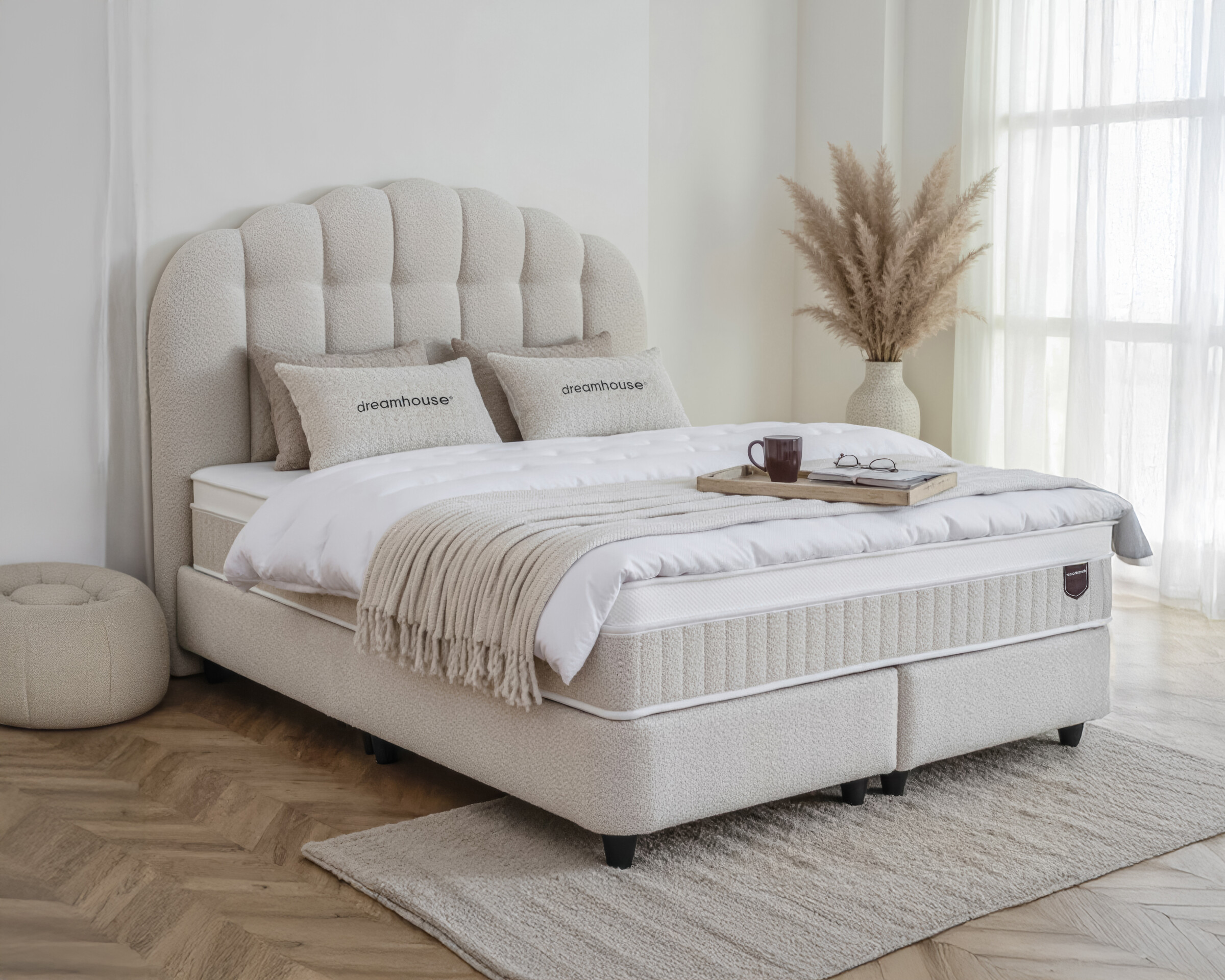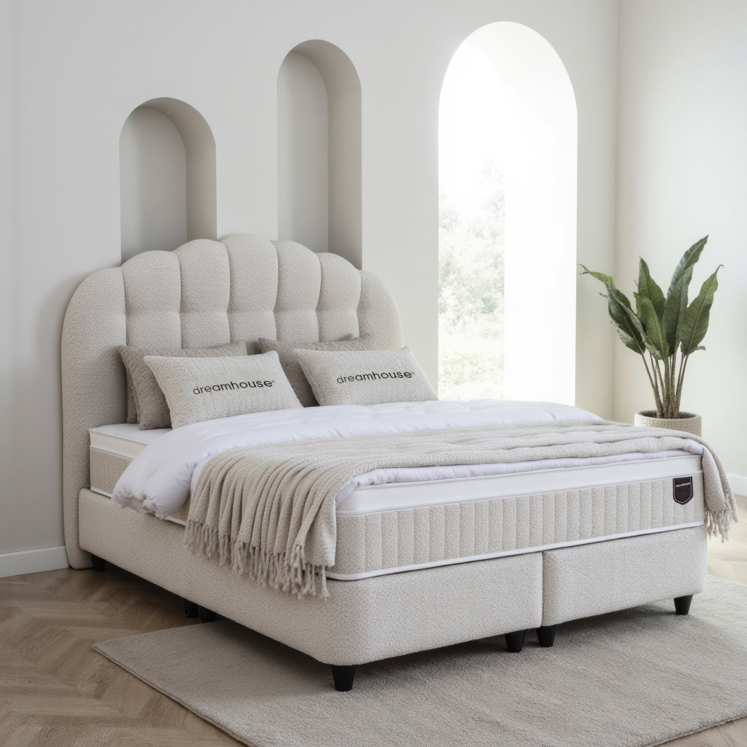 De Dreamhouse Gradia is een unieke combinatie van handgemaakt design en functioneel comfort. Het royale hoofdbord straalt ambachtelijke luxe uit door het gewelfde boho-patroon en de zachte teddy bouclé stof. Deze boxspring is een stijlvol pronkstuk in de slaapkamer, met de slimme toevoeging van royale opbergruimte onder het bed.