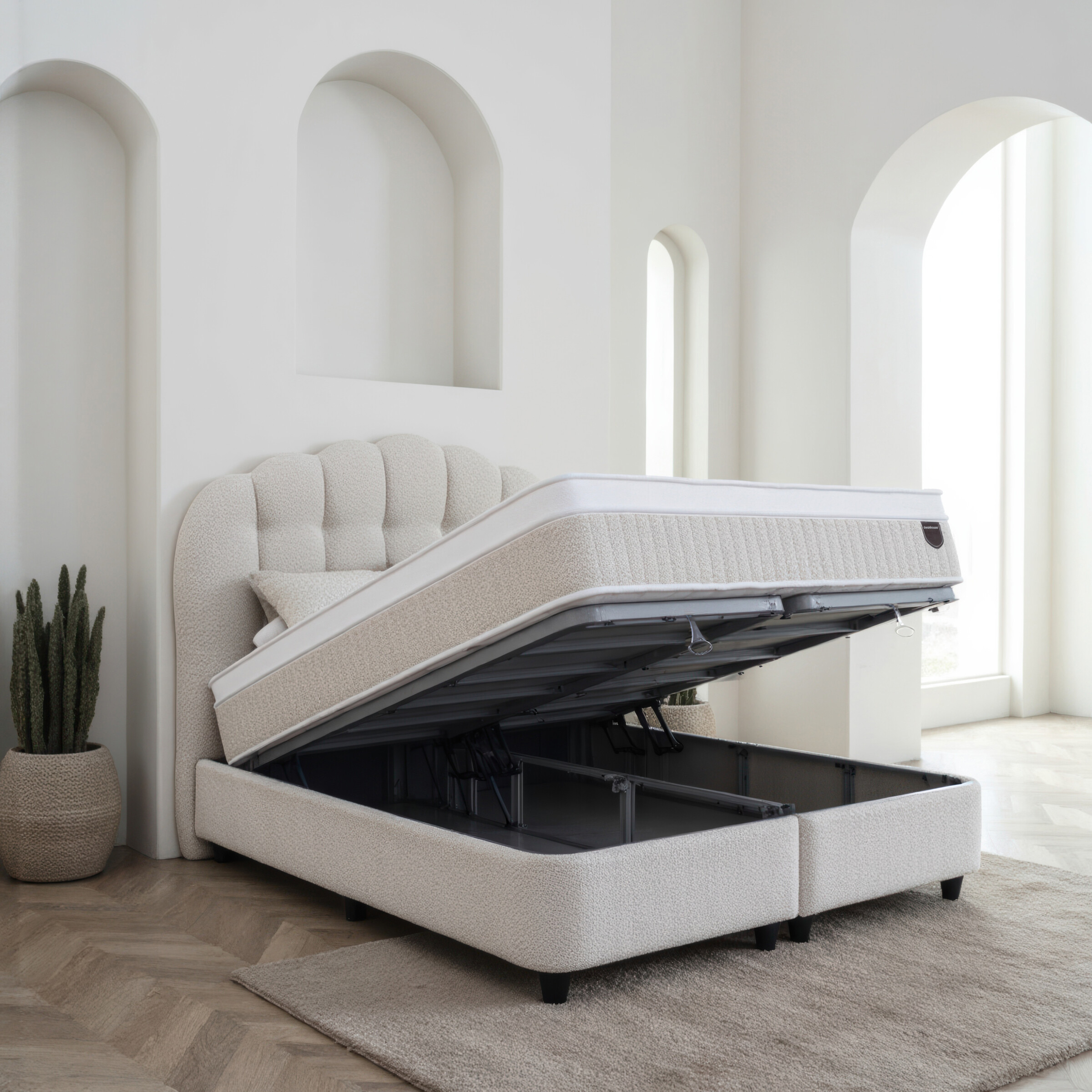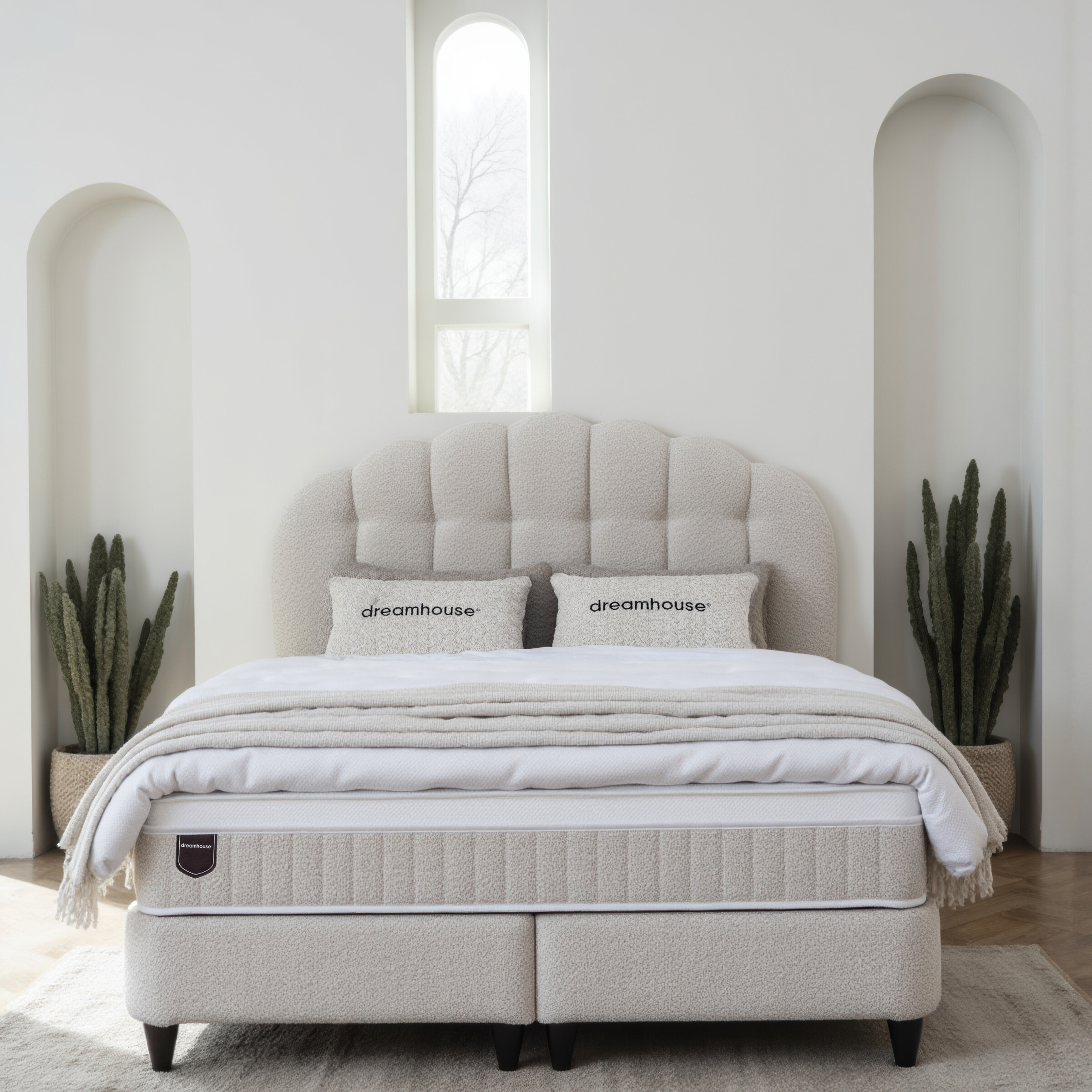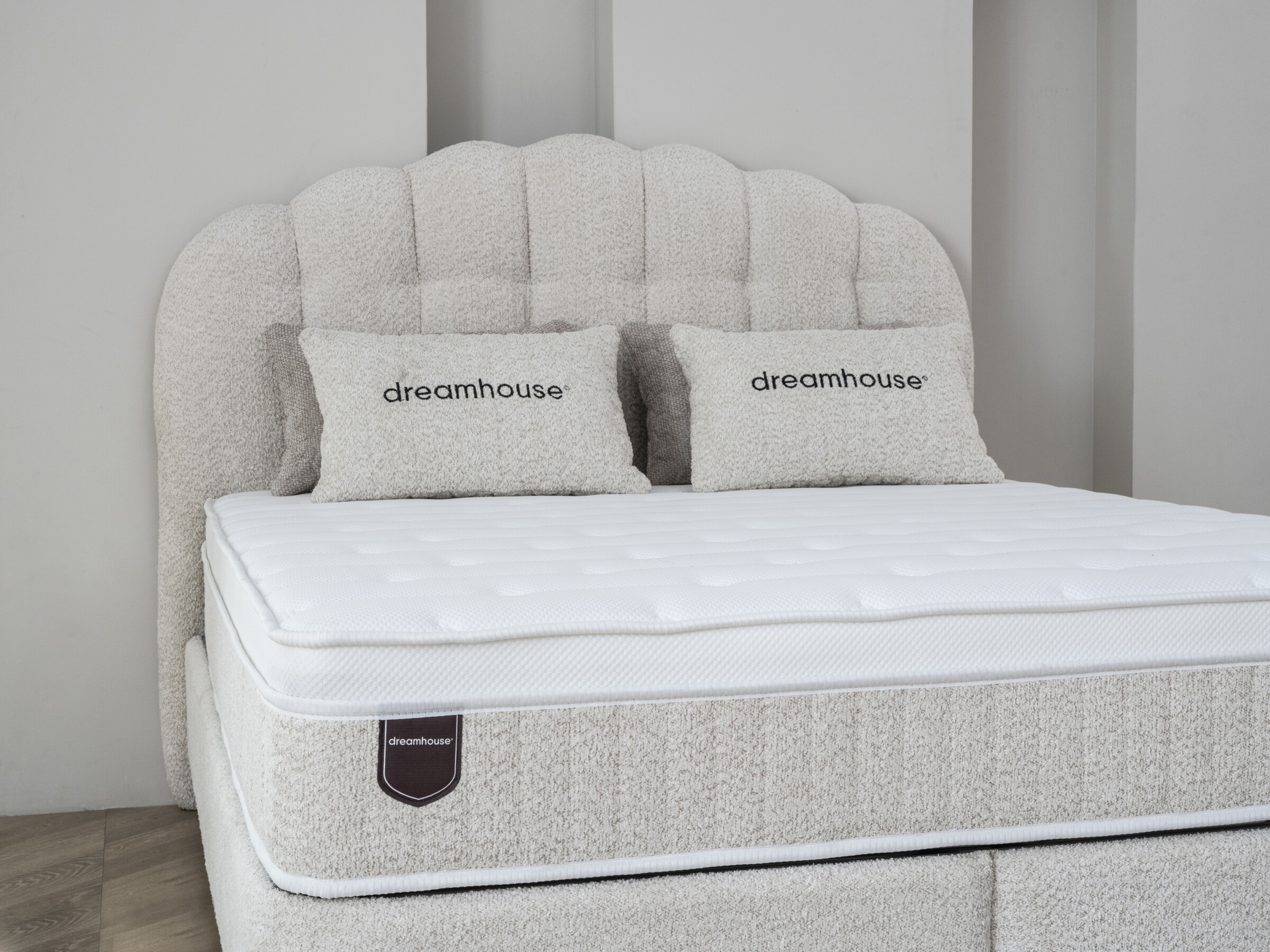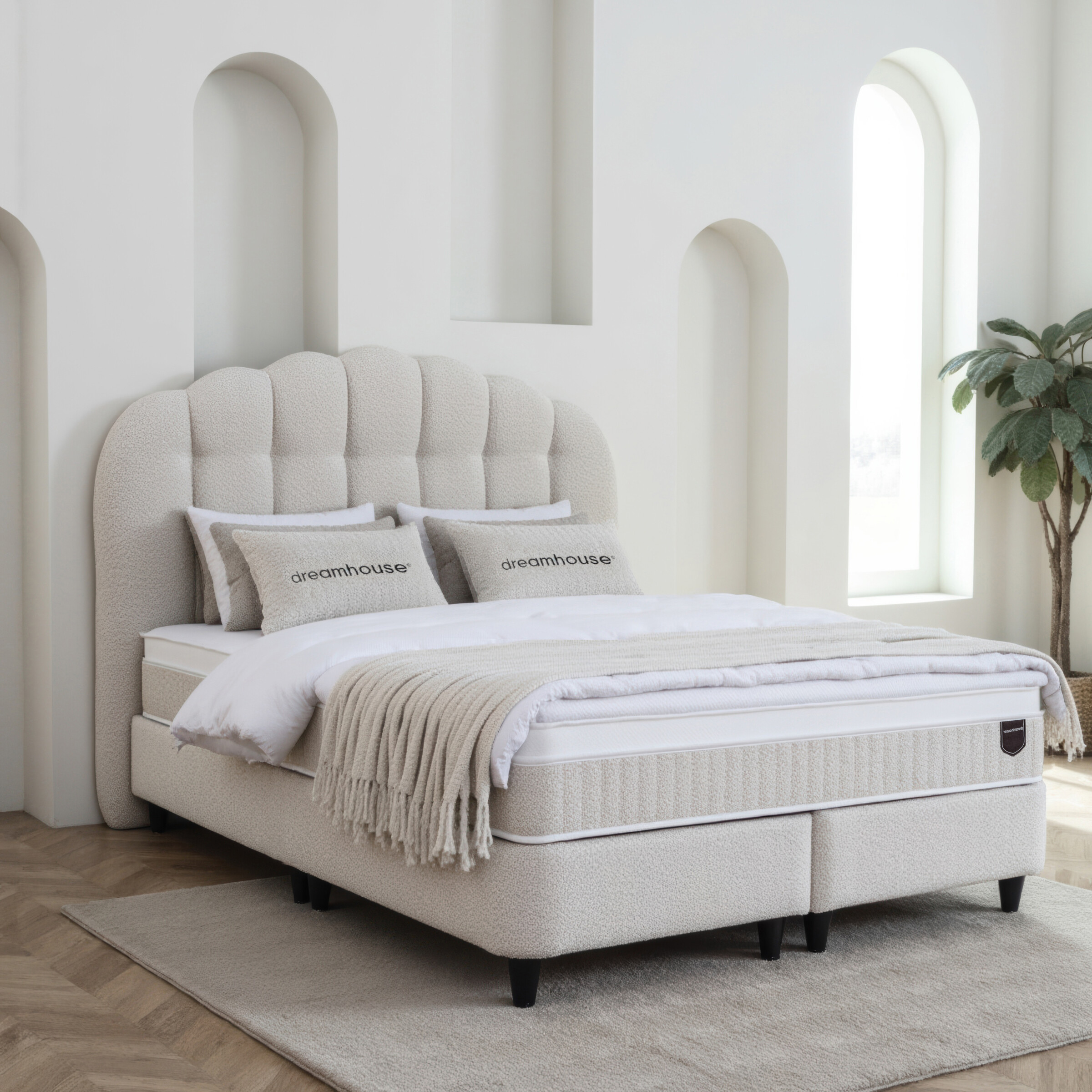 De Dreamhouse Gradia is een unieke combinatie van handgemaakt design en functioneel comfort. Het royale hoofdbord straalt ambachtelijke luxe uit door het gewelfde boho-patroon en de zachte teddy bouclé stof. Deze boxspring is een stijlvol pronkstuk in de slaapkamer, met de slimme toevoeging van royale opbergruimte onder het bed.