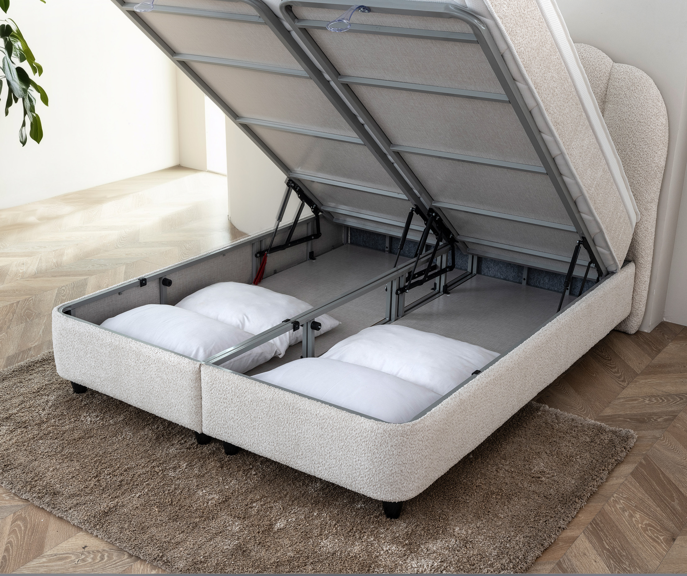 Onder het bed bevindt zich een slimme opbergruimte, toegankelijk via een stevig systeem met vier voorgemonteerde gasveren van 1000 newton. De onderboxen zijn vervaardigd uit een metalen frame met gefineerde dekselplaten, wat zorgt voor duurzaamheid en eenvoud in gebruik. Perfect om extra beddengoed of seizoensartikelen in op te bergen.