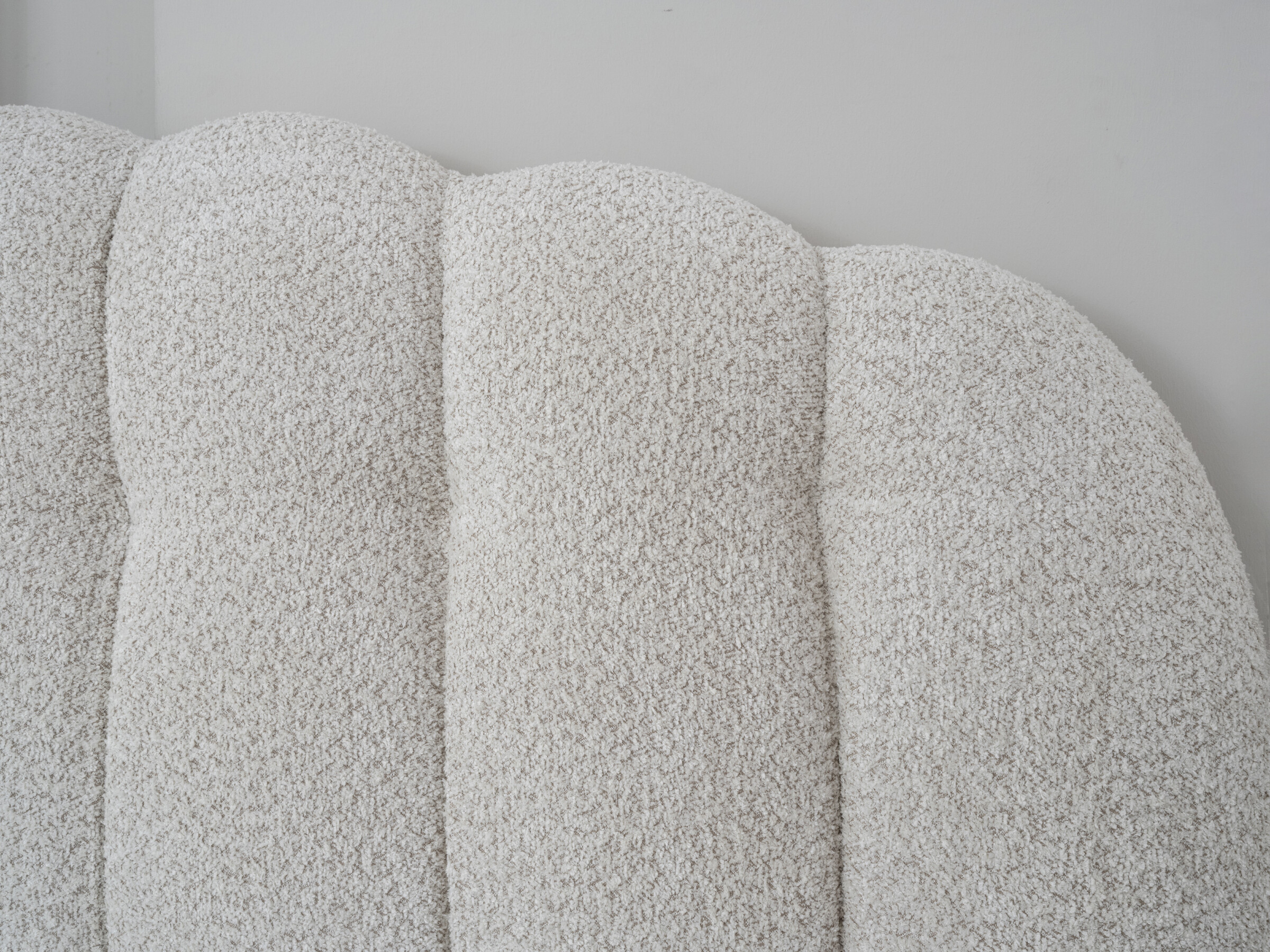 Het hoofdbord van de Gradia is een ware blikvanger. Het golvende patroon en de subtiele stoffering in zachte teddy bouclé creëren een uniek boho-effect dat warmte en rust uitstraalt. Met een hoogte van 133 cm en een breedte van 188 cm vormt het een indrukwekkend maar stijlvol middelpunt in de slaapkamer.