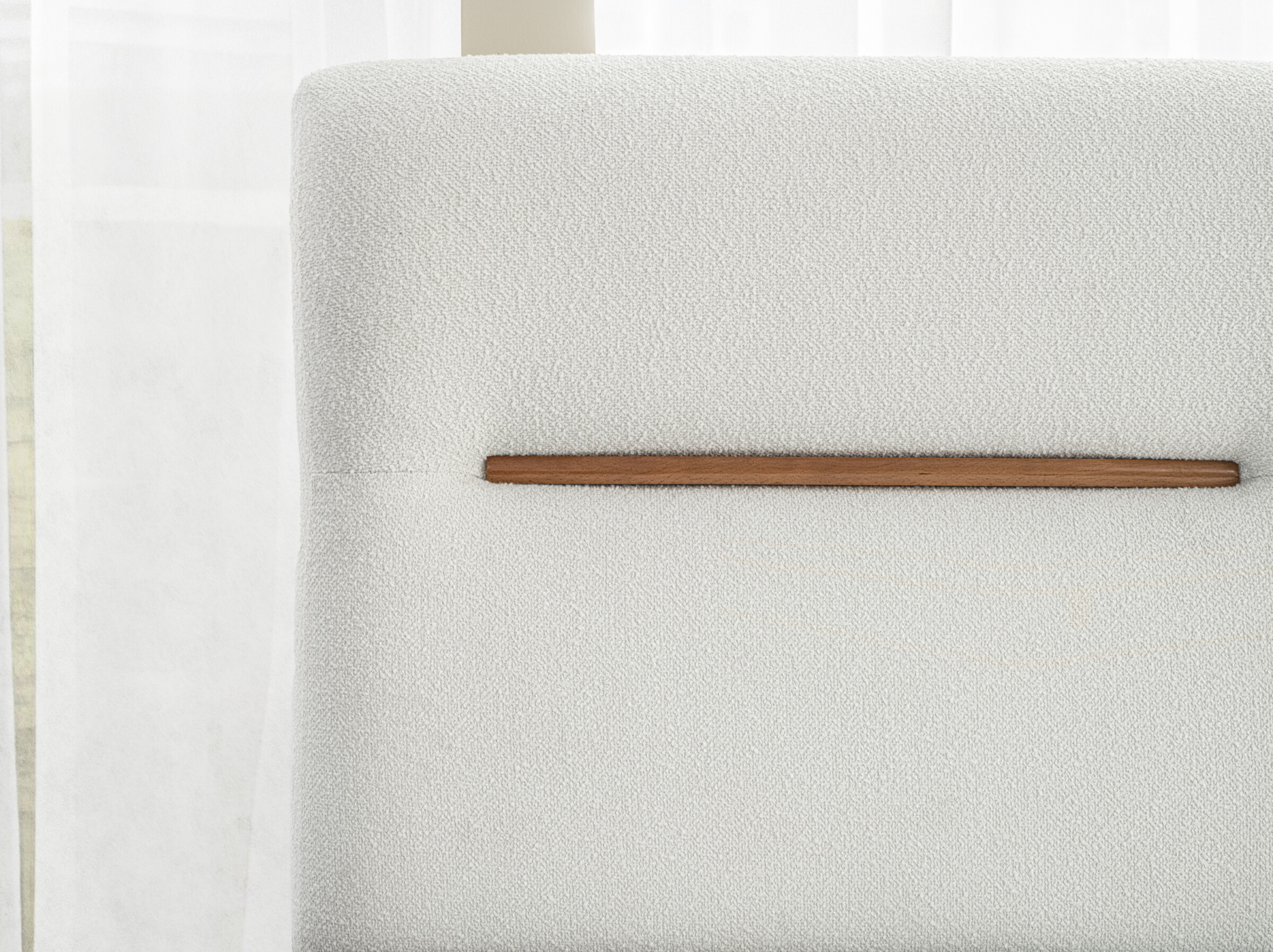 Het hoofdbord van de Oakline ademt rust. De hoge, zachte vlakken zijn stijlvol bekleed met teddy bouclé stof en voorzien van een elegant houten accent. Deze combinatie van warme stoffen en natuurlijke materialen sluit perfect aan bij de Japandi en Scandinavische woontrends van dit moment. Het geeft het bed een tijdloze, kalme uitstraling.
