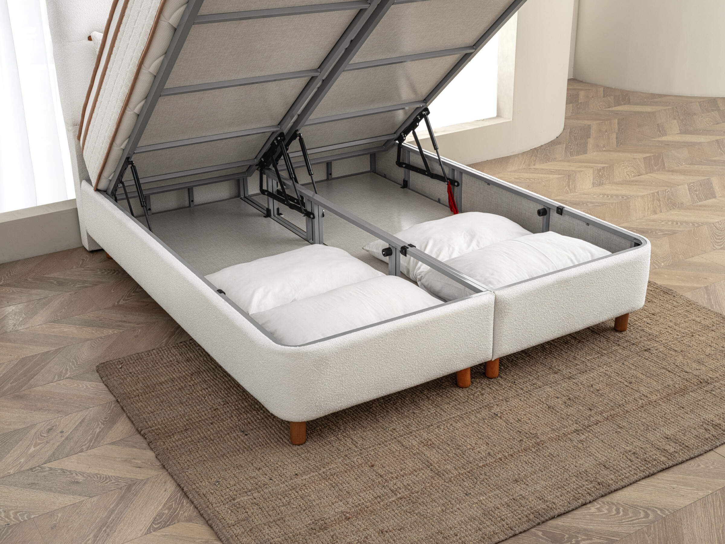 Onder de boxspring vind je een handige opbergruimte, bereikbaar via een voorwaartse opening met 4 krachtige gasveren (1000 newton). Het metalen frame en de gefineerde deksel maken dit systeem extra stevig en duurzaam. Ideaal voor het opbergen van extra beddengoed, kleding of kussens zonder in te leveren op uitstraling.