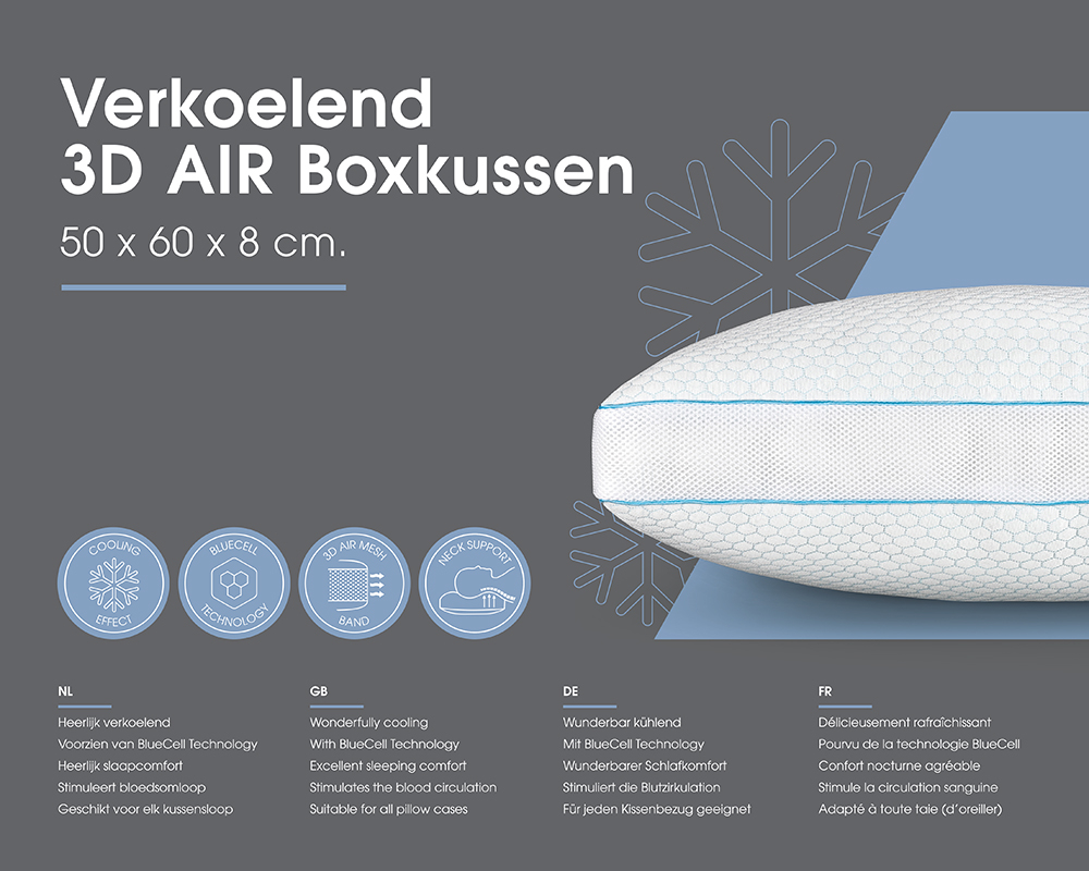Ervaar optimaal slaapgemak met dit verkoelende boxkussen. Dit kussen met 3D-luchtventilatieband, zorgt voor de juiste houding tijdens het slapen en corrigeert de nek door de hoge border. Dankzij de vochtregulerende en warmte afvoerende eigenschappen, biedt dit kussen optimaal slaapcomfort. Het kussen heeft een fijne afwerking en een zachte vulling.